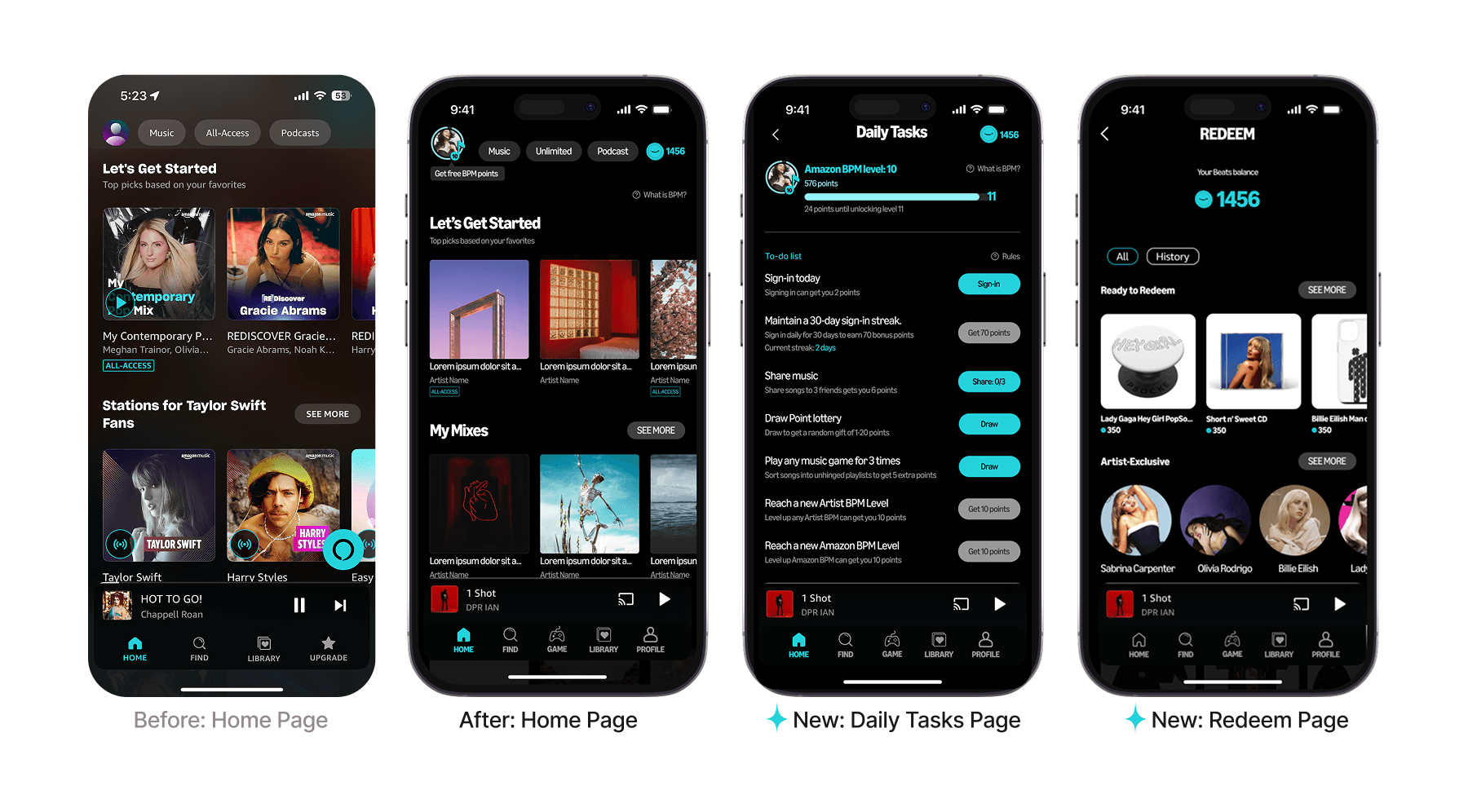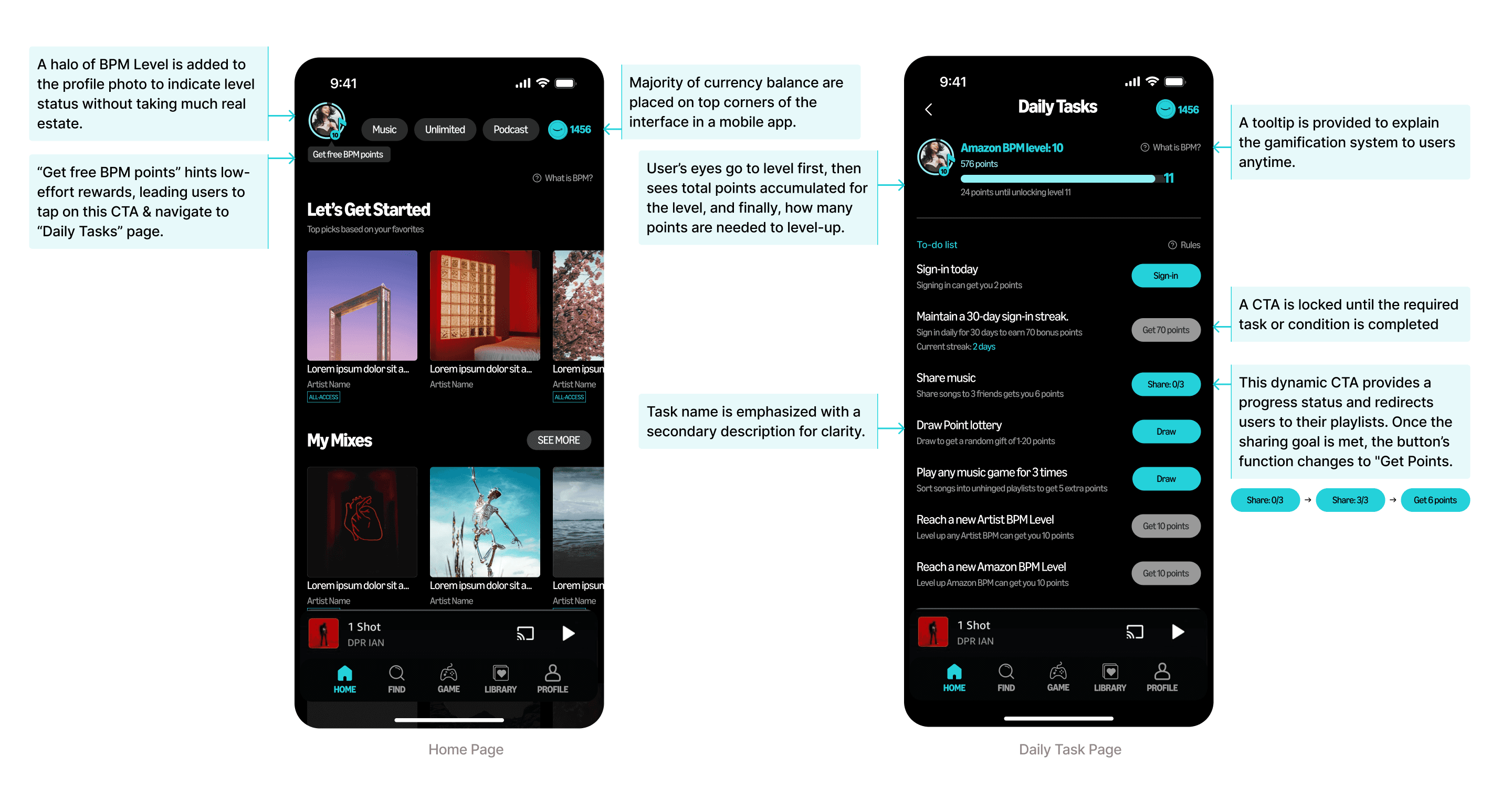 We added a few elements to Amazon Music's Home Page to incorporate the UI of the gamification feature without cluttering the screen, while designed a new page "Daily Tasks" to give user a list of low-effort tasks and help them get more points to level-up. Some tasks are designed to incentivize users to spend more time on the app and use the app everyday.