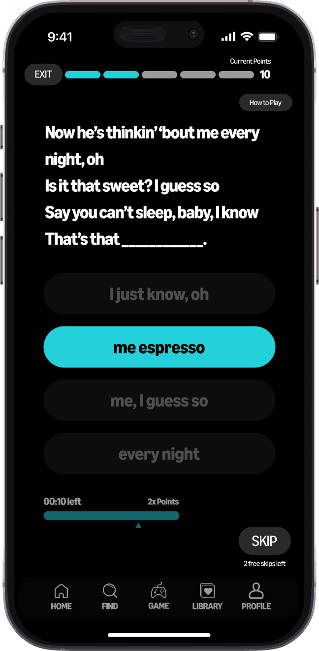 Listeners can select an artist they want to quiz their lyrics knowledge in. They will be asked to fill in the blank with the correct lyrics after hearing the song snippet.