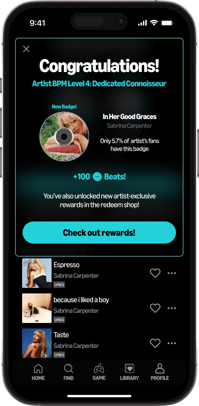 Level up by playing artist trivia games, and engage with artist and community activities, like pre-saving new releases.