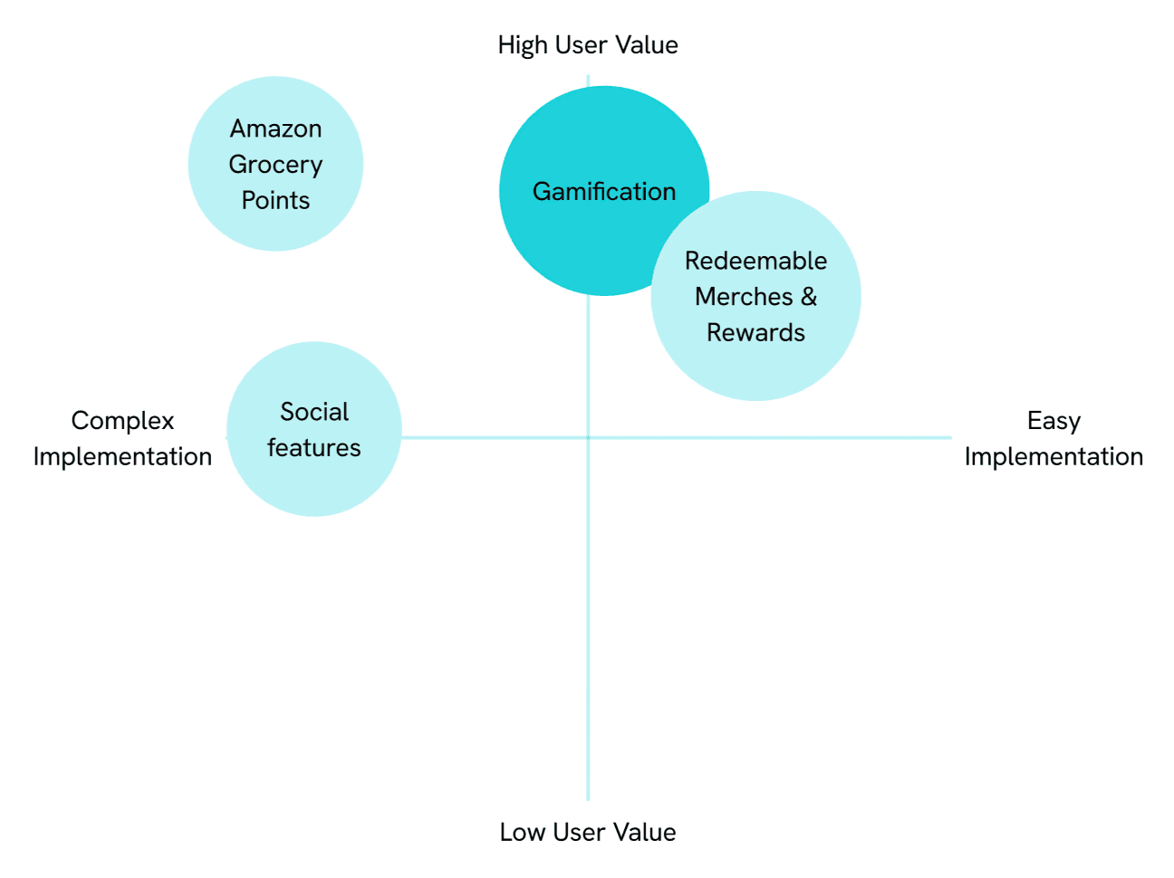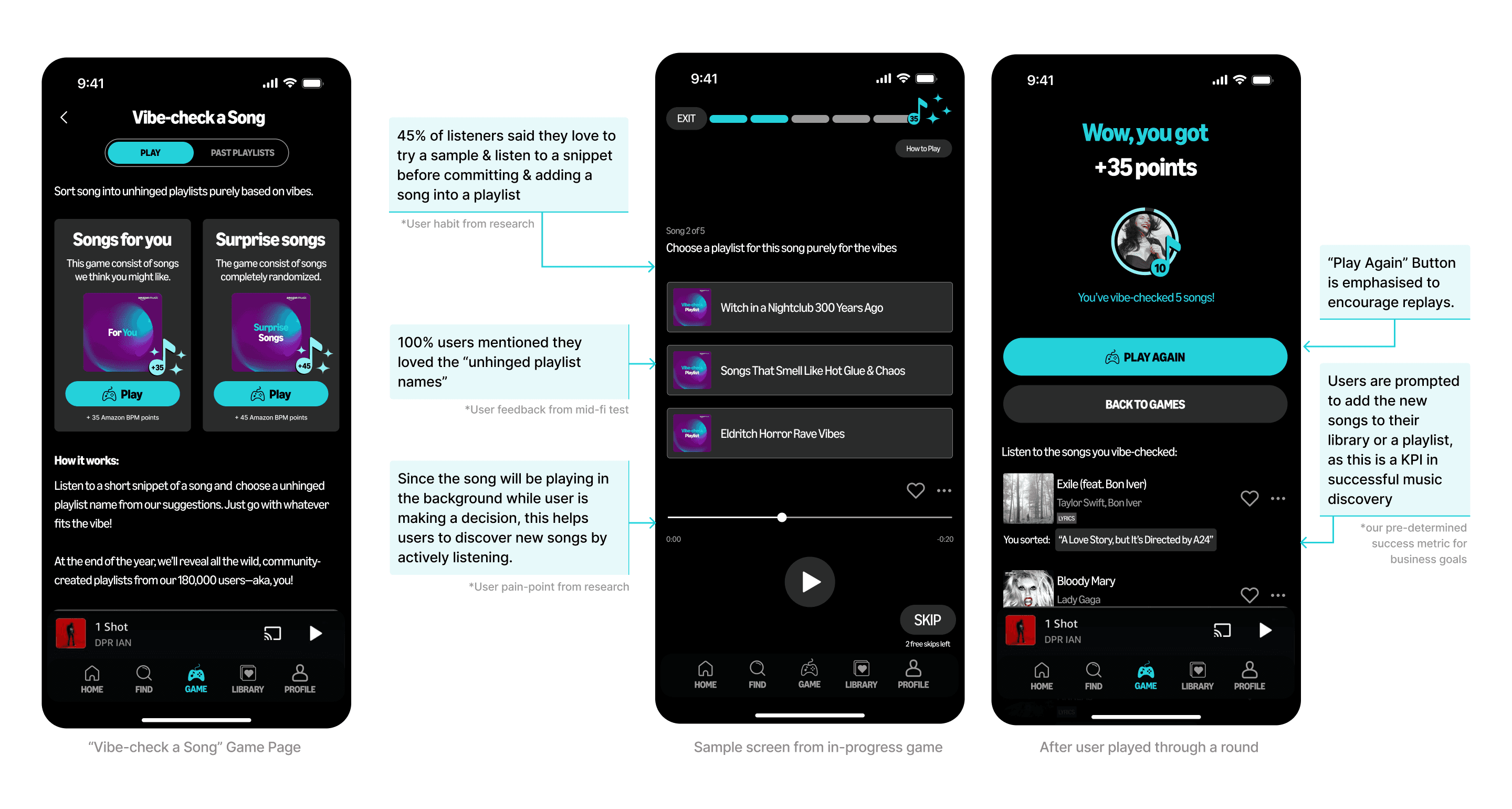 Using a User Value x Implementation matrix scale, we want the product solution to best balance between answering the user pain-points that came up during research, and relatively easier to implement. After our prioritization session, we brought our ideas to consult our 2 Amazon Music Product Manager mentors, who also agreed that gamification is the most ideal solution compared to the other 2.