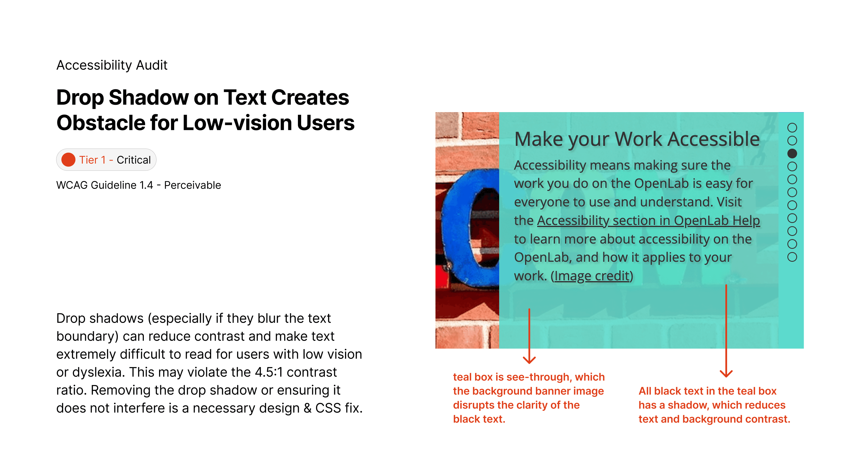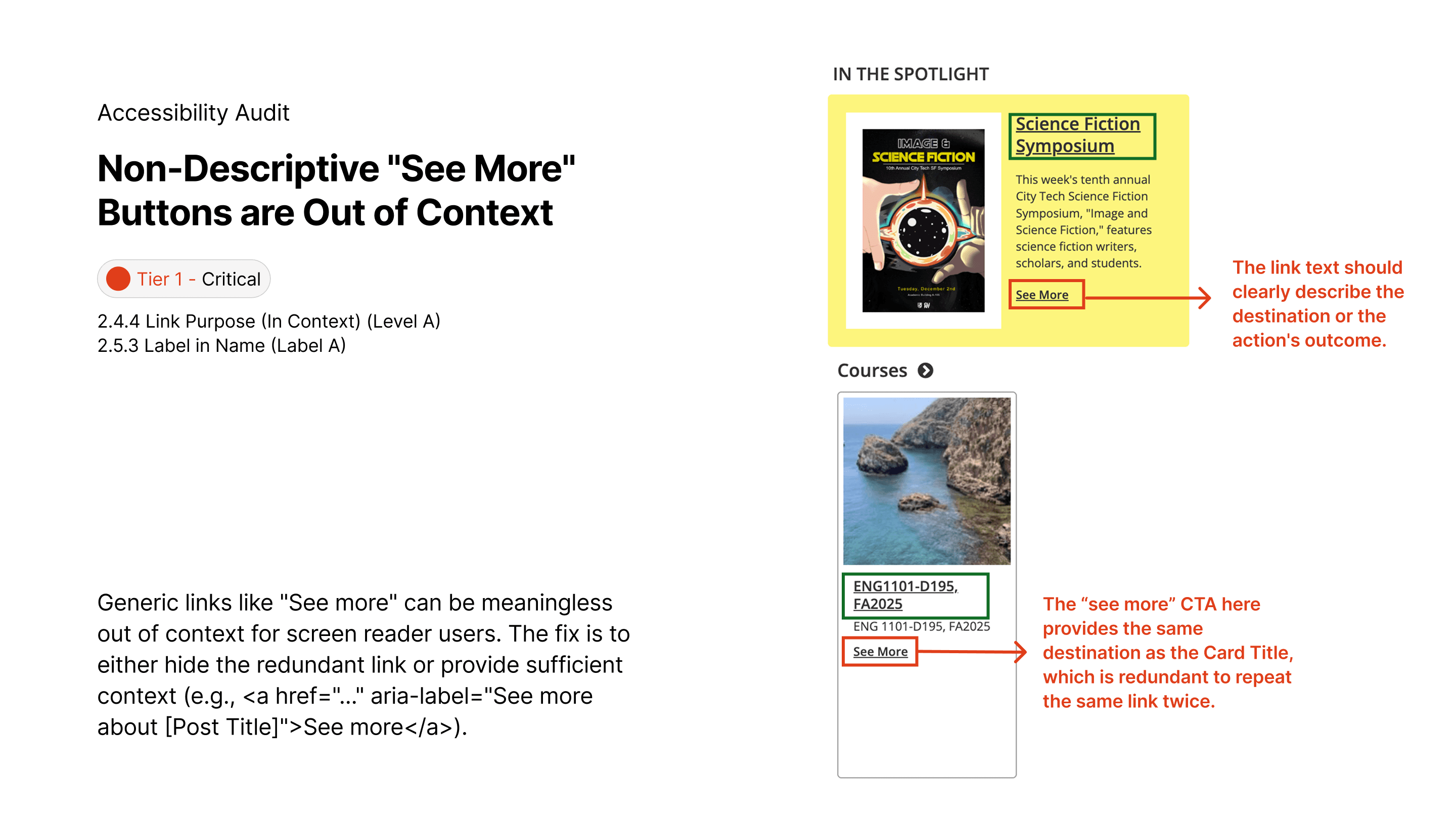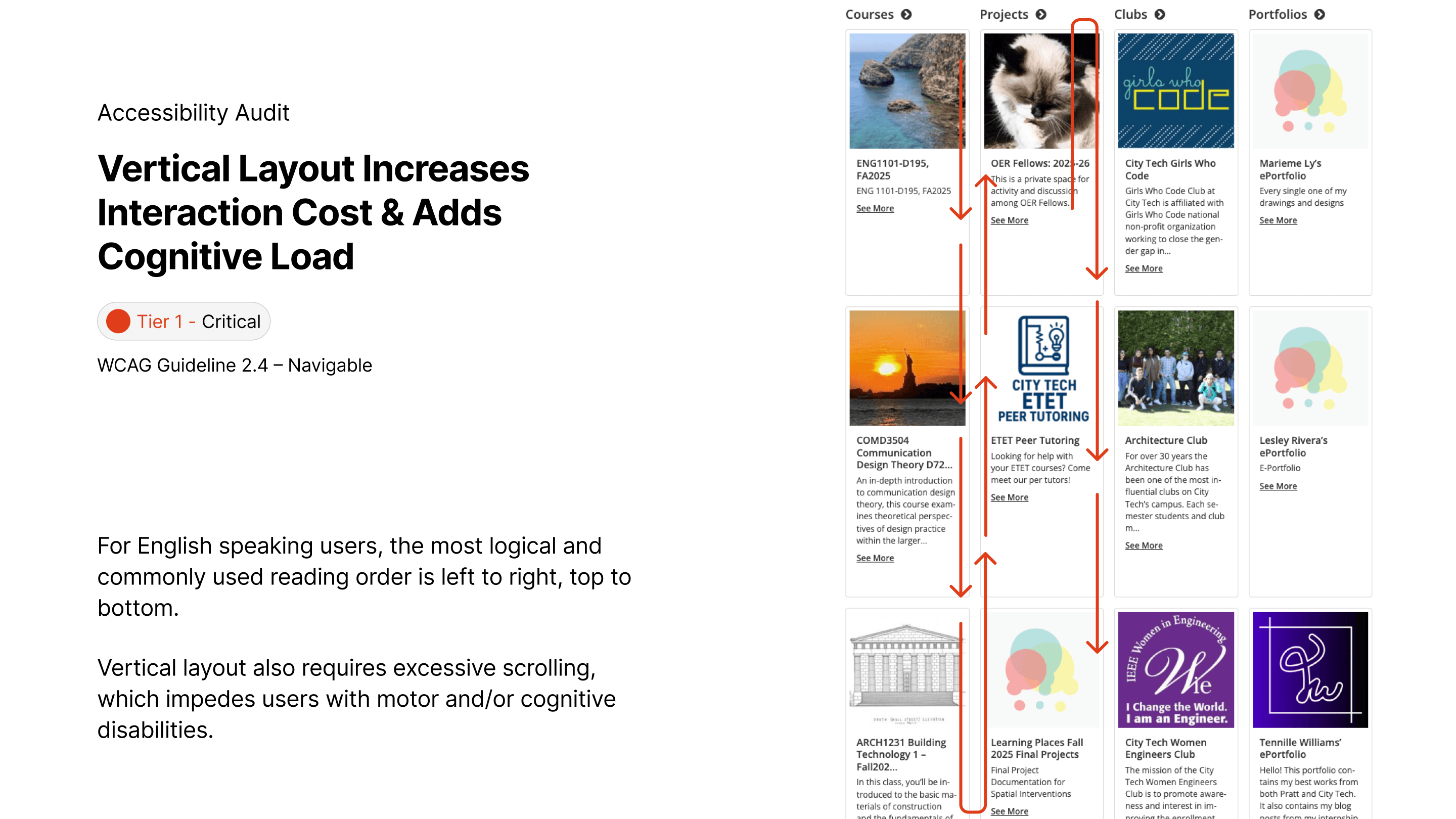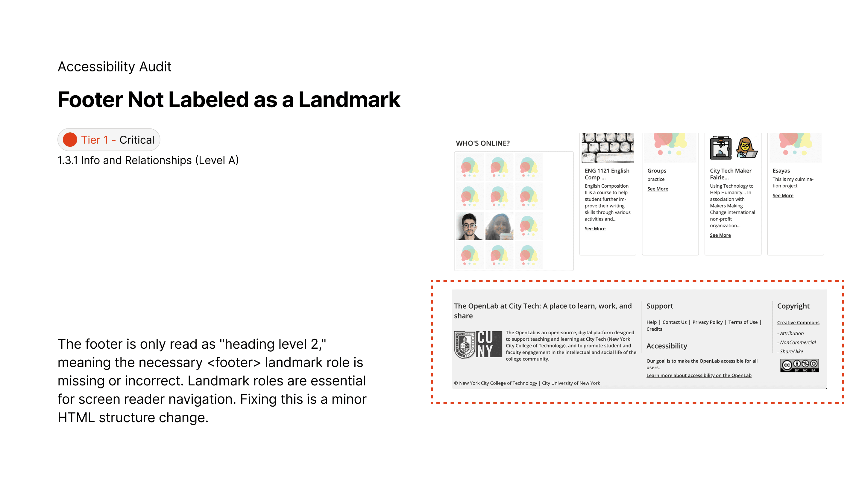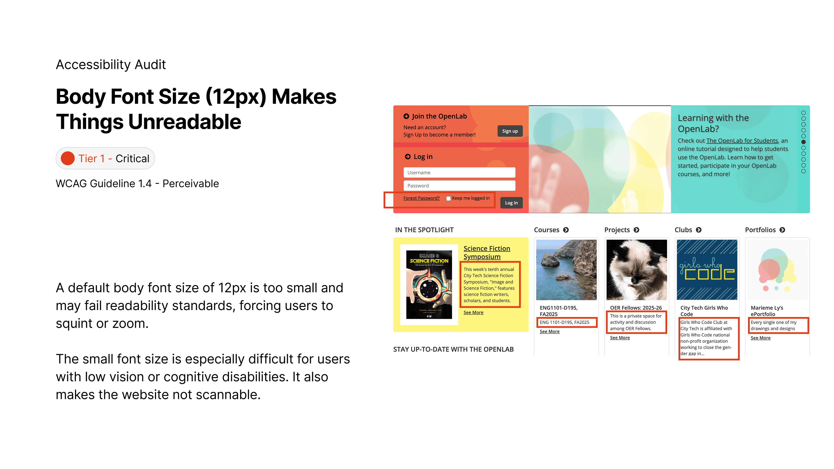 A WCAG 2.2 AA audit, redesign & annotation of the City Tech OpenLab, focusing on cognitive and keyboard accessibility for over 20,000 users, prioritizing minimal development resources.