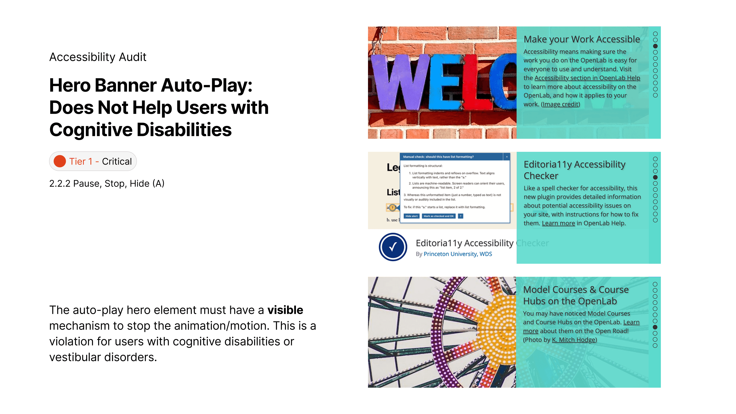Adding a play/pause control helps user with cognitive disabilities navigate through the Home Page, and helps any user who simply do not like too much moving graphics!