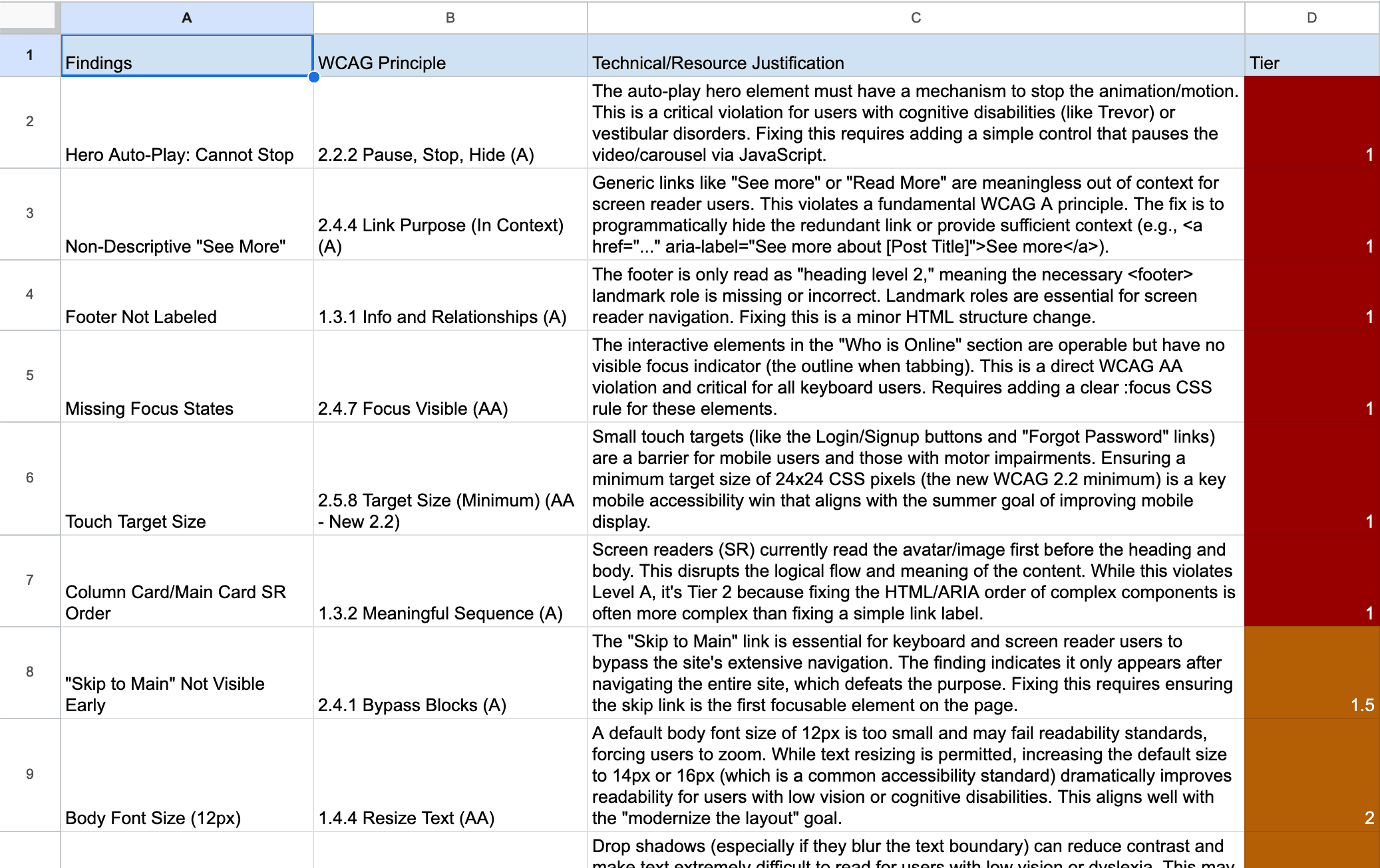 We delivered a comprehensive, prioritized guide that empowered the client's small development team to immediately address critical, low-cost accessibility issues, aligning their summer development efforts with legal compliance (WCAG 2.2 Level AA) and improved user experience. The Tier 3 recommendations now serve as the foundation for future grant applications and full site redesigns.