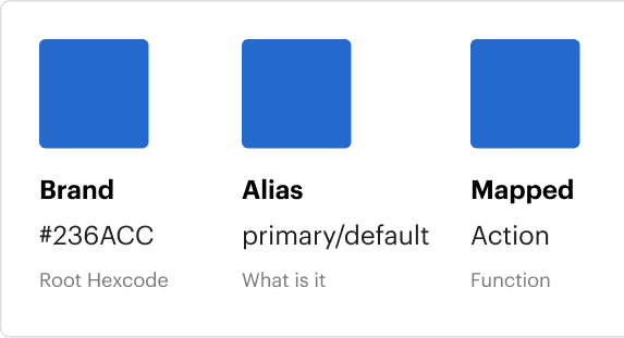 Using color as an example, the Brand level includes the hexcode, the Alias level is the name we associate the color with, and the Mapped level is how the color is used.